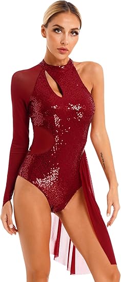 Womens Glitter Sequins Figure Ice Skating Dress One Shoulder Leotard Lyrical Dance Performance Costume