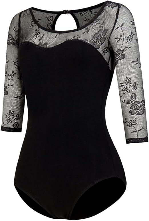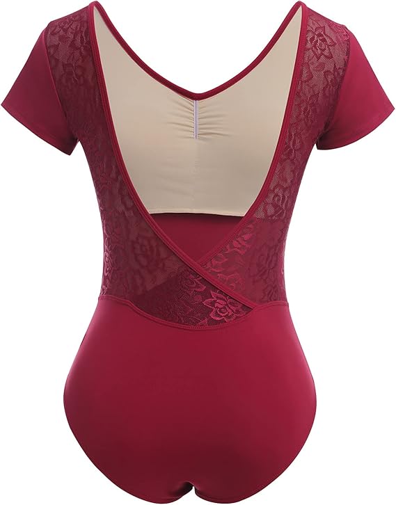 Dance Leotards for Women Short Sleeve Lace Ballet Leotards Mesh Lace Wrap V-backless Bodysuit Gymnastics Leotards Tops