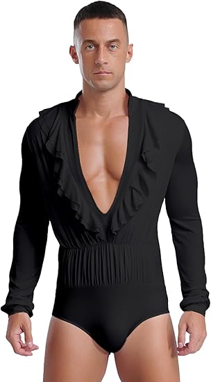 Men's Deep V-Neck Latin Dance Leotard Long Sleeve Cha Cha Dance Shirt Competition Bodysuit Top