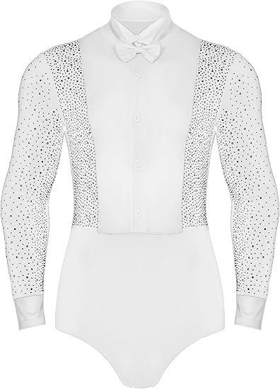 Men's Shiny Rhinestones Latin Ballroom Dance Leotard Color Block Long Sleeve Shirts with Bowtie