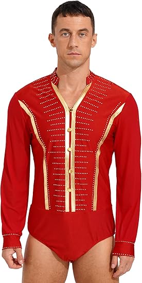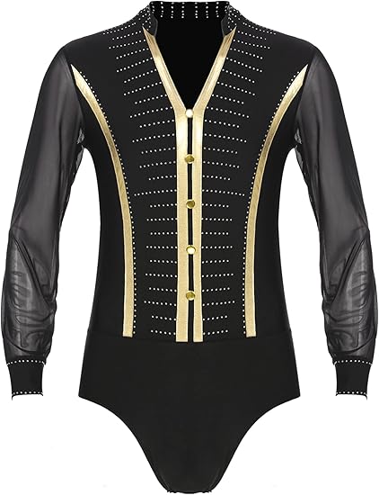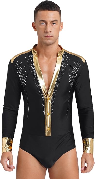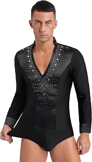 Men's Latin Ballroom Dance Leotard Long Sleeve V Neck Tango Dance Shirt One-piece Unitards Rompers