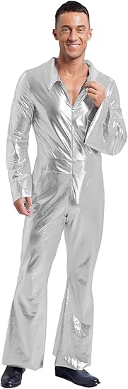70s Costume for Men 70s Disco Outfit Metallic Shiny Party Jumpsuit One Piece Lapel Leotard