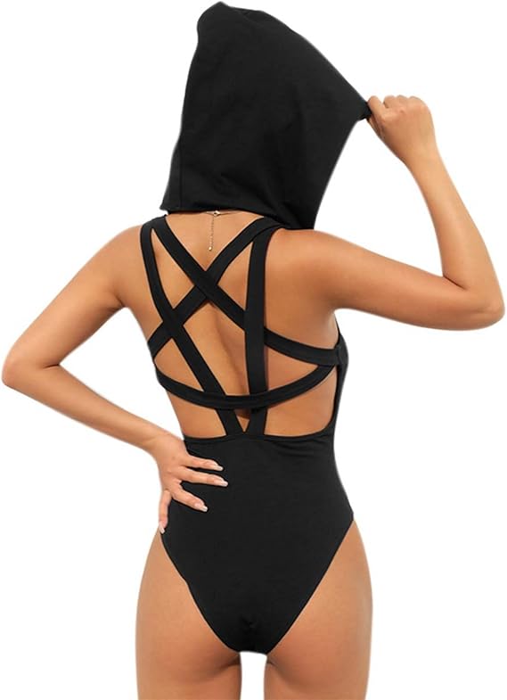 Women Rave Pentagram Bodysuit Jumpsuit Sexy Hoodie Festival Clothing Romper for Dance Party Clubwear