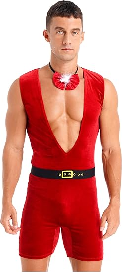 Men Christmas Santa Claus Wrestling Singlets Jumpsuit Unitard Bodysuit Dance Leotard Underwear
