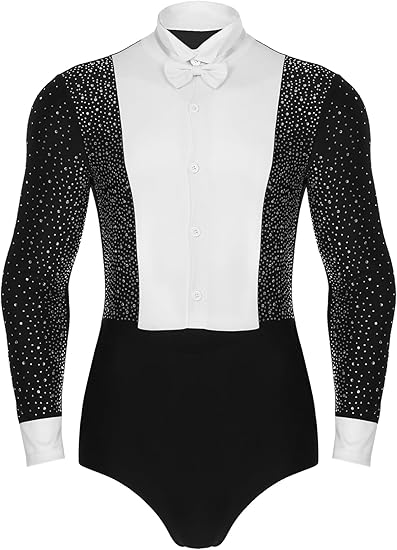 Men's Sparkly Ballroom Rumba Latin Dance Shirt Modern Dance Leotard Bodysuit with Bowtie
