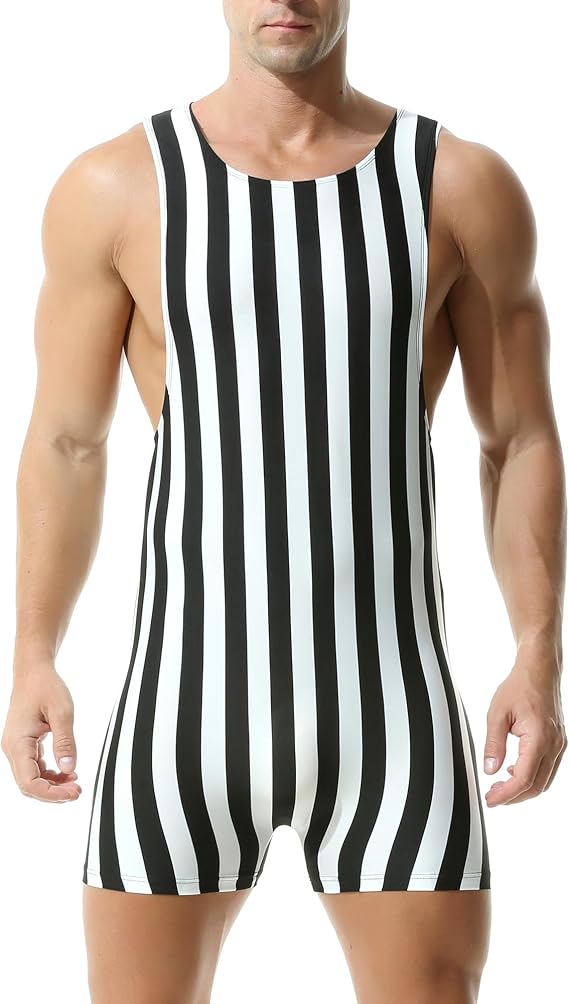 Mens Striped Wrestling Singlet Bodysuit One Piece Swimsuit Stretchy Base Layers Pajamas Leotard Athletic Jumpsuit
