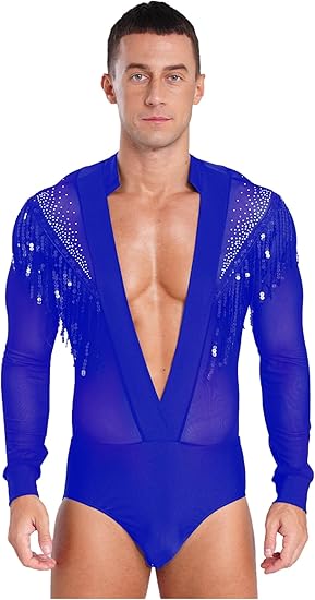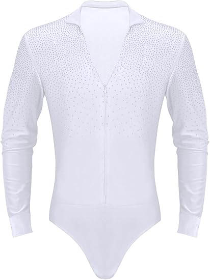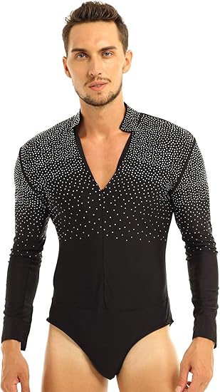 Mens Shiny Rhinestones Long Sleeve Latin Tango Rumba Dance Costume Shirt V-neck Stand Collar Leotard Bodysuit