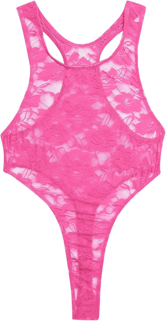 Men's Lace Bodysuit High Cut One Piece Leotard Sleeveless Sheer Mankini Lingerie Racerback Undershirts Top