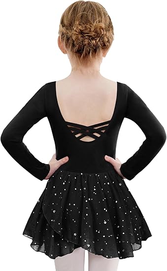 Girls Ballet Leotards Long Sleeve Shiny Skirted Crisscross Back Toddler Leotard Dresses Dance Outfits