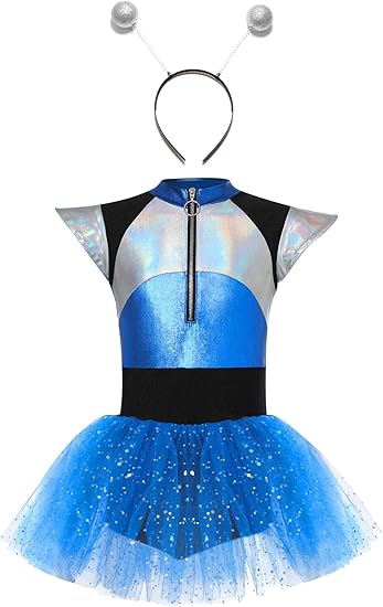 Girls Alien Costume Set Metallic Tutu Dance Dresses Leotard for Outer Space Man Halloween Cosplay Dress Up